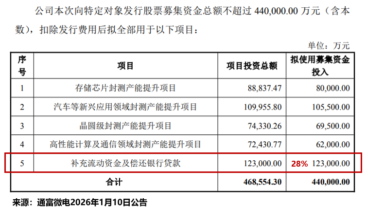 1月10日,通富微电发布定增说明书,拟定增募资不超过44亿元用于存储芯片封测产能提升、汽车等新兴应用领域封测产能提升等项目以及补充流动资金和偿还贷款。