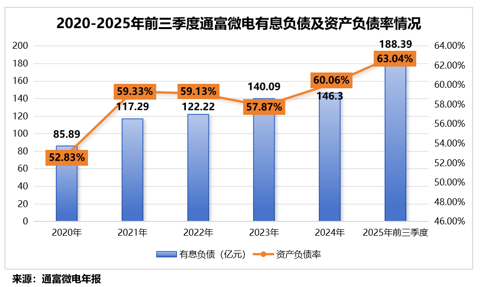 截至2025年三季度末,公司有息负债高达188.39亿元,资产负债率也从2020年的52.83%攀升至63.04%。