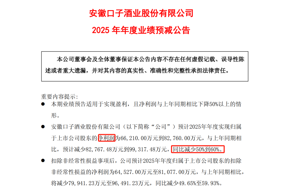 真正的产业信号,往往隐藏在冰冷的财务数字里。日前“徽酒老三”口子窖交出2025年业绩预告,其归母净利润预计同比锐减50%—60%,仅为6.62亿至8.28亿元。