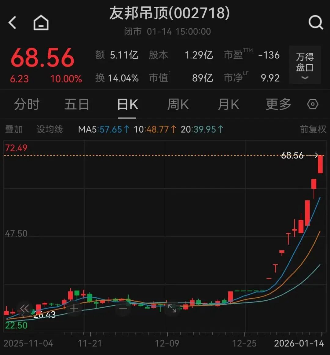 友邦吊顶公告称,股票自2026年1月12日以来连续3个交易日涨停,连续9个交易日内收盘价格涨跌幅偏离值累计涨幅达到103.76%,显著偏离大盘指数,短期波动幅度较大,已明显偏离市场走势,存在较高的炒作风险,属于股票交易严重异常波动的情形。如未来公司股票价格进一步上涨,公司可能向深圳证券交易所申请停牌核查,投资者参与交易可能面临较大风险。