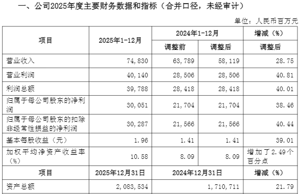 具体而言,2025年,中信证券实现营业收入748.30亿元,同比(与前一年同期相较)增加28.75%;归属于母公司股东的净利润(下称“净利润”) 300.51亿元,同比增加38.46%。