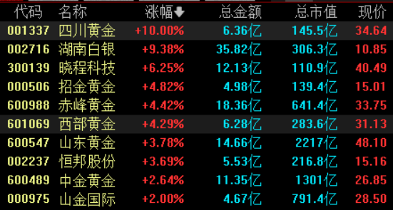 四川黄金涨停,湖南白银涨超9%,招金黄金、西部黄金涨超4%,山东黄金、中金黄金等跟涨。