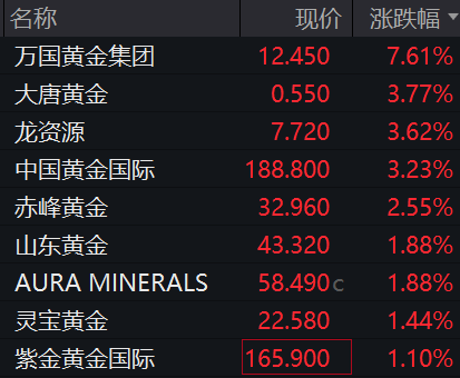 港股贵金属板块亦走高,截至发稿,万国黄金国际涨超7%,大唐黄金、中国黄金国际涨超3%。