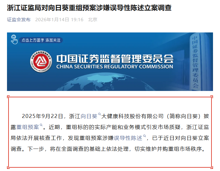 据中国证监会1月14日晚消息,2025年9月22日,向日葵披露重组预案。近期,重组标的的实际产能和业务模式引发市场质疑,浙江证监局依法开展核查工作,发现重组预案涉嫌误导性陈述,已于近日对向日葵立案调查。