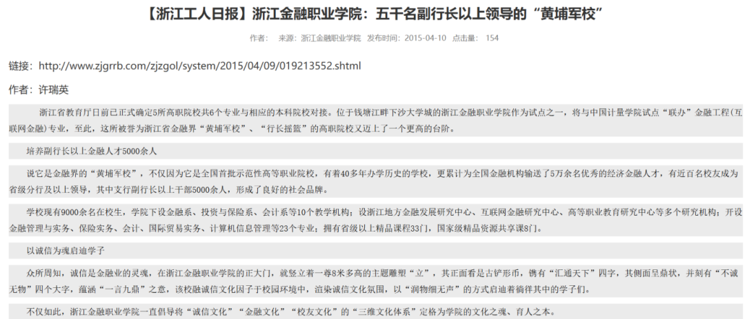 2015年4月的一则当地媒体报道显示,浙江金融职业学院累计为全国金融机构输送了5万余名优秀的经济金融人才。