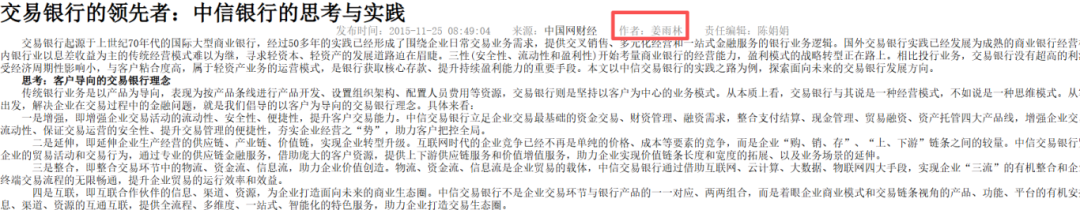 2015年11月,姜雨林以中信银行总行公司银行部总经理的身份公开发文。
