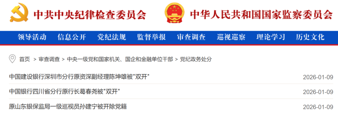 仅1月9日一天,中央纪委国家监委网站便连续通报三起金融领域干部受处分情况。