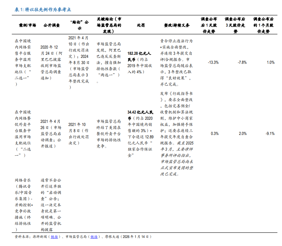 瑞银复盘了历史数据:阿里巴巴在立案调查公布当天H股下跌13.3%,美团仅下跌0.3%(此前已有预期),但在随后漫长的调查期内,市场情绪始终受到压抑。花旗也表达了类似观点,认为调查在结束前将持续影响市场情绪,短期估值下调不可避免。