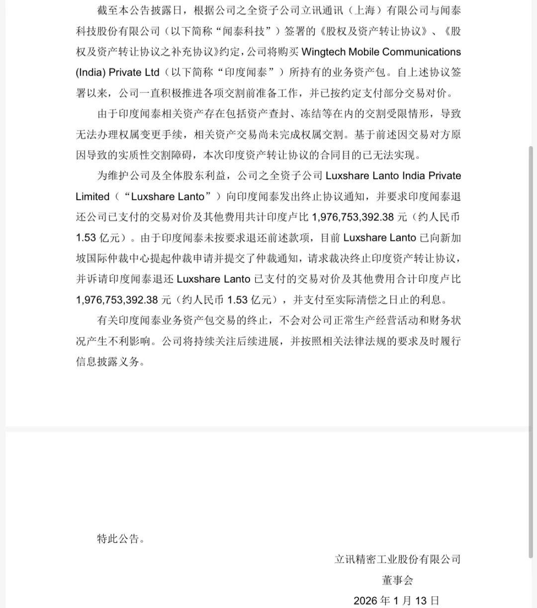 公告披露,立讯精密全资子公司Luxshare Lanto India Private Limited(下称“立讯联滔”)已向新加坡国际仲裁中心提起仲裁申请,请求裁决终止印度资产转让协议,并要求印度闻泰退还已支付的对价及相关费用合计印度卢比19.77亿元(约人民币1.53亿元),并支付相应利息。