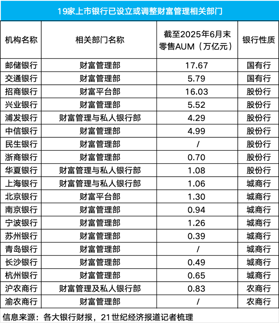 已有19家上市银行设立或调整了财富管理相关业务部门,涵盖2家国有大行、7家股份制银行、8家城商行及2家农商行。