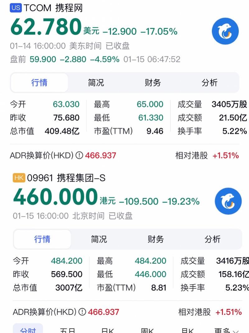 事件发生后,携程美股盘前持续走低,目前已跌超17%,港股方面,携程今日同样大跌,收盘股跌超19%。