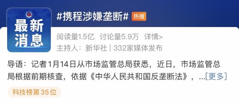 近日,市场监管总局根据前期核查,依据《中华人民共和国反垄断法》,对携程集团有限公司涉嫌滥用市场支配地位实施垄断行为立案调查。