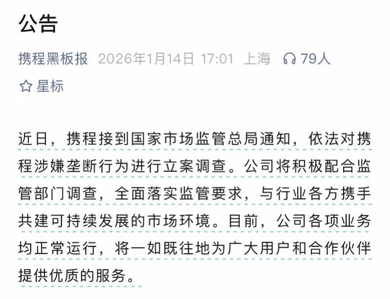 携程方则回应称,公司将积极配合监管部门调查,全面落实监管要求,与行业各方携手共建可持续发展的市场环境。目前,公司各项业务均正常运行,将一如既往地为广大用户和合作伙伴提供优质的服务。
