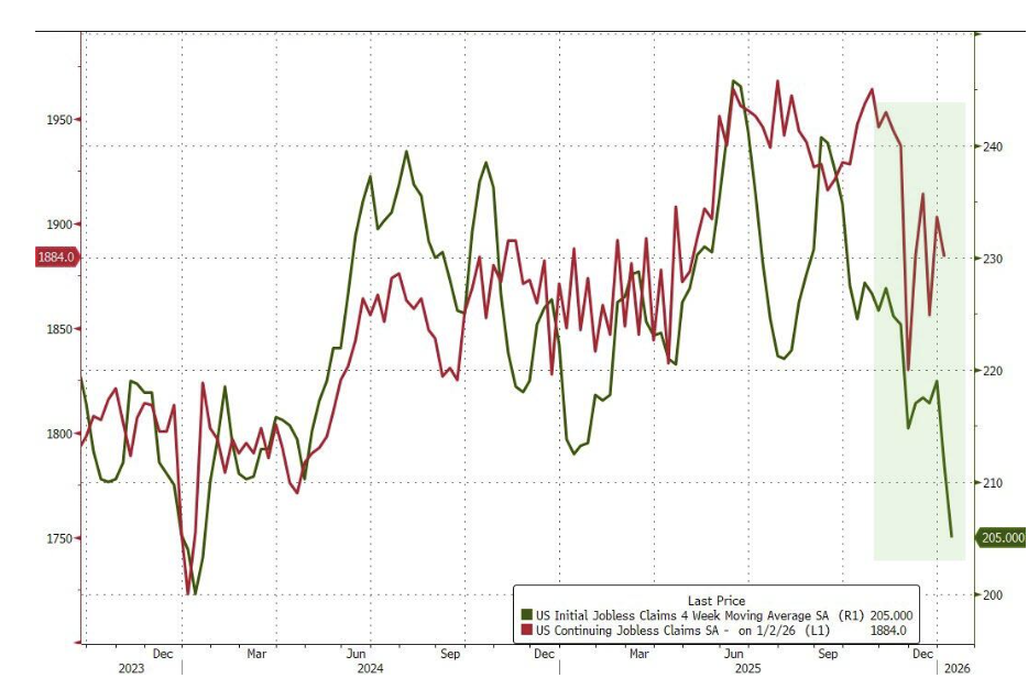 1月15日,美国劳工部最新数据显示,截至1月10日当周,美国首次申请失业救济人数降至19.8万人,显著低于市场预期的21.5万人,也低于前值20.8万人。