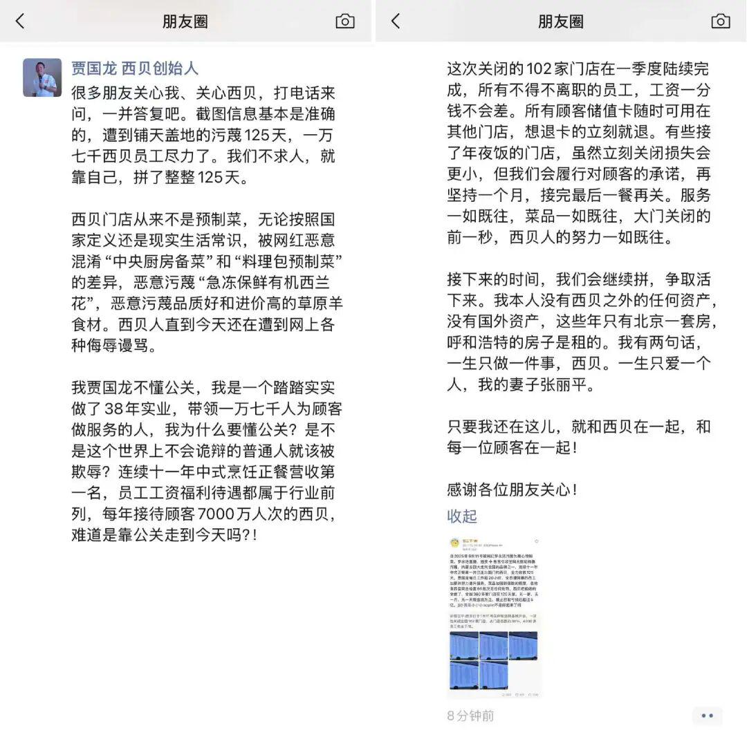 15:30分左右,贾国龙在微信发布了一条“千字朋友圈”,对关店一事进行了统一回复。其中提到几个关键信息: