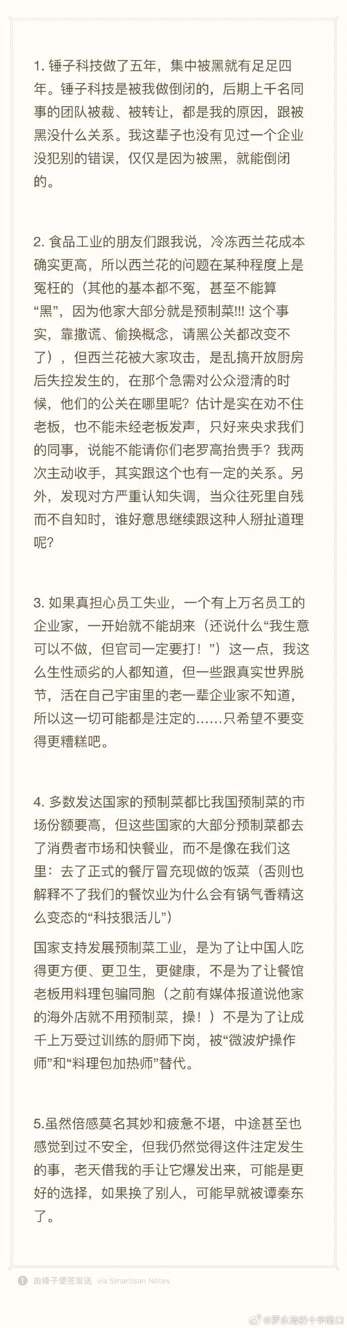 就此前双方之间关于预制菜的争执,罗永浩在上述长文中表示,“食品工业的朋友们跟我说,冷冻西兰花成本确实更高,所以西兰花的问题在某种程度上是冤枉的(其他的基本都不冤,甚至不能算‘黑’,因为他家大部分就是预制菜!!! 这个事实,靠撒谎、偷换概念,请黑公关都改变不了)。”