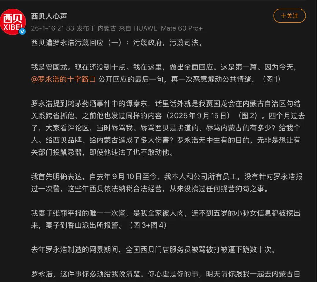 1月16日晚间,在行业的高度关注中,西贝创始人贾国龙并未如外界预想般开启视频直播“就罗永浩对西贝的重大污蔑诽谤一一全面回应”,而是通过“西贝人心声”官方微博进行了首篇文字回应,直指罗永浩恶意煽动公共情绪,并发出公开对质邀约。