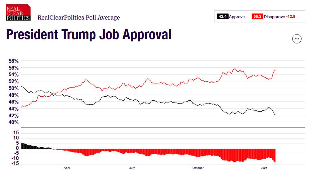 其次,特朗普政策未能通过大规模干预降低生活成本。主街利率仍然很高,如果能源、保险、医疗以及人工智能推高的电力价格未能下降,特朗普的低支持率将难以改善。目前特朗普总体支持率为42%,经济政策支持率为41%,通胀政策支持率仅为36%。