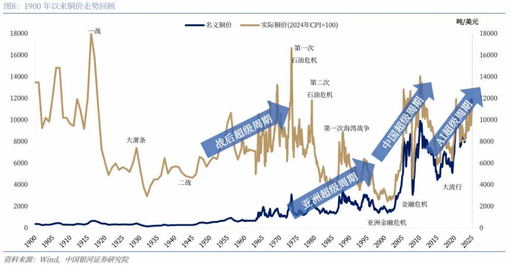 比如,1949—1980年的战后超级周期,二战结束后,欧洲和日本大规模重建,城市化快速推进。与此同时,智利、赞比亚等产铜国推动铜矿国有化,供给不确定性增加。在需求复苏与供给约束的双重作用下, 铜价经历了25年的震荡上行。