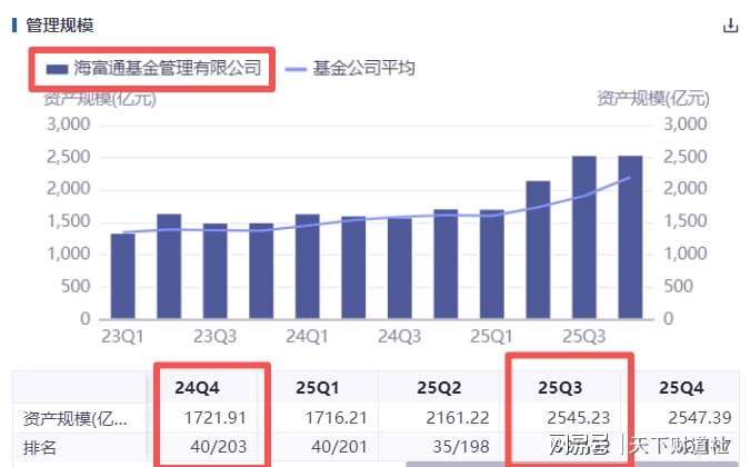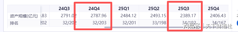 其中,国投瑞银2024年末规模比海富通高出超千亿元,而2025年三季度末,已被海富通超越。