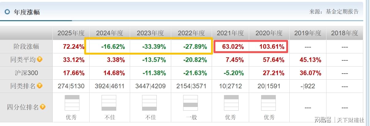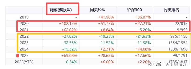 以施成目前管理规模最大的国投瑞银新能源混合为例,其典型折射了施成这几年的收益规律——2020年、2021年重仓新能源获得超额收益,2022-2024年陷入大额亏损、2025年通过赛道切换实现业绩反弹。