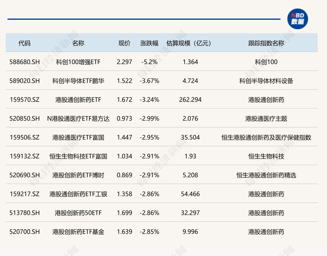 下跌方面,科创100增强ETF跌超5%,科创半导体ETF鹏华跌超3%,多只港股创新药相关ETF跌约3%。