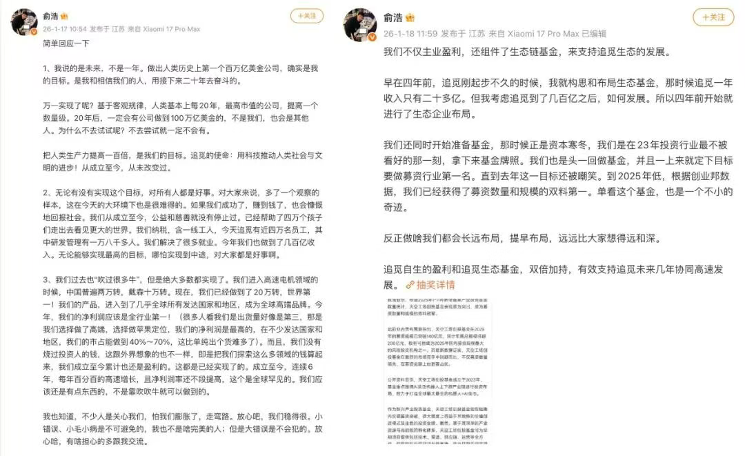 近日,追觅科技 CEO 俞浩在微博发文,针对此前朋友圈「百万亿美金的公司生态」言论进行了回应。他强调,相关目标并非一年内实现,而是一个二十年的长期愿景。
