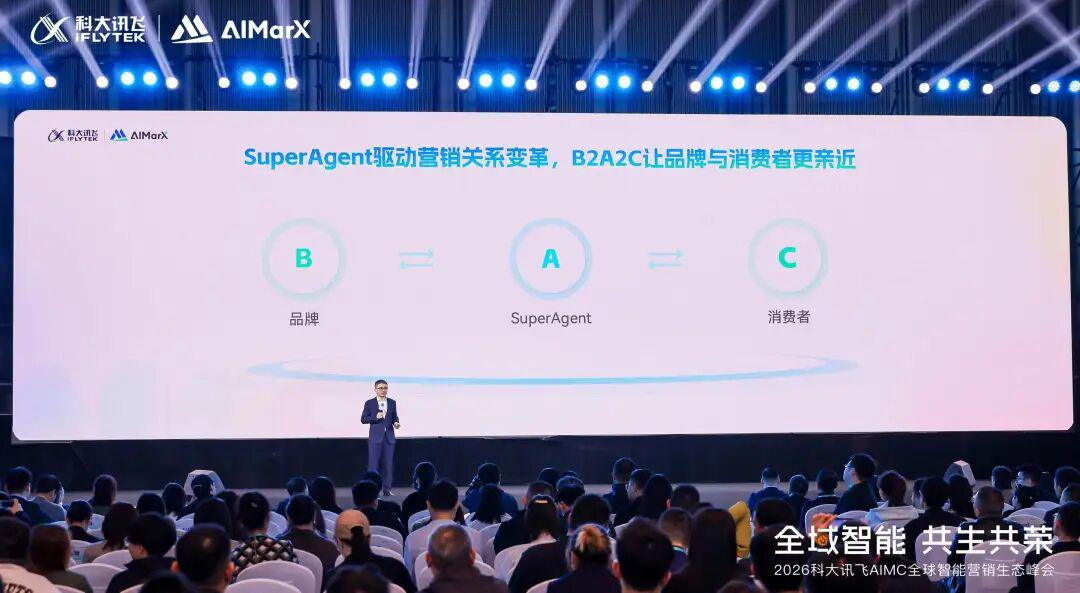 正是在这样的行业背景下,近日在2026科大讯飞AIMC智能营销生态峰会上,讯飞AI营销(AIMarX)提出营销SuperAgent的应用框架,并重磅发布基于SuperAgent构建的营销智能体平台。 科大讯飞副总裁、AI营销业务群总裁李平表示,SuperAgent与传统Agent的核心区别,可以从架构模式和能力标准两个维度来理解,实现了一种“从单体智能到群体智能”“从线性逻辑到五维进化”的质变。