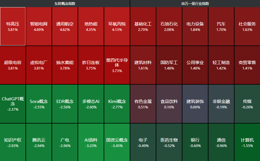 分行业来看,基础化工、石油石化、电力设备、汽车、社会服务等行业领涨,计算机、通信、银行等行业领跌。