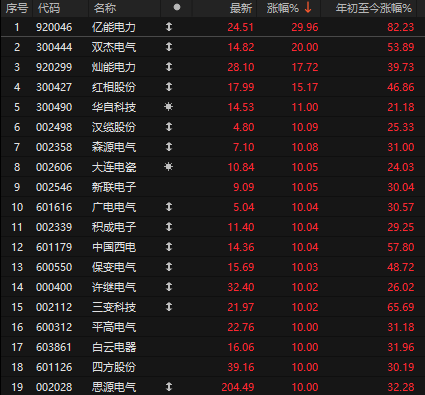 上周我反复提示电网设备是对冲市场投机的较优板块,今天电网设备板块是最靓的仔,亿能电力、双杰电气、中国西电、保变电气、许继电气等数十只个股涨停,千亿市值的思源电气两连板。