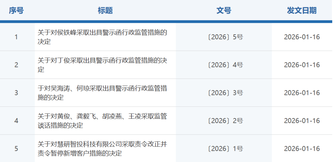 其中,山西证监局于1月16日对慧研智投及其核心管理层一口气下发5份行政监管措施决定书,要求公司暂停新增客户3个月。