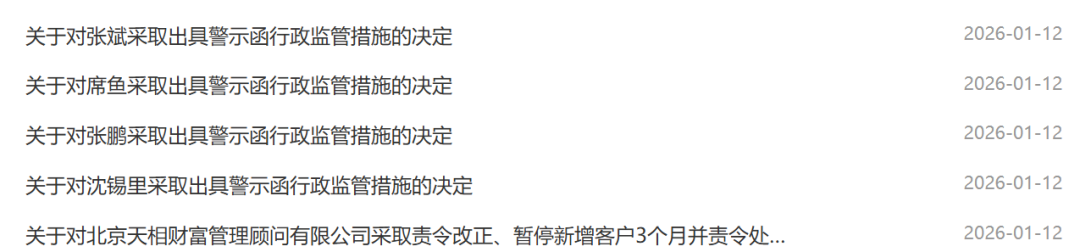 1月12日,北京证监局发布行政监管措施决定书,指出天相财富存在虚假、不实、误导性宣传,以及通过公众媒体账号直接给出具体证券买卖建议等问题,且对前期监管指出的问题整改不到位,反映出公司合规管理和内控机制存在明显缺陷。