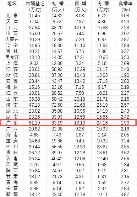 第一,广东家庭观念强,重视代际传承。《中国统计年鉴2025》显示,全国结婚总人数最多的是广东省,为51.19万对,也是全国唯一一个结婚登记超过50万对的省份,且已连续三年位居全国第一。而且,广东结婚数第一,但离婚率仅1.90‰全国倒数,被调侃为“敢爱不敢恨”(其实是重情重义)。