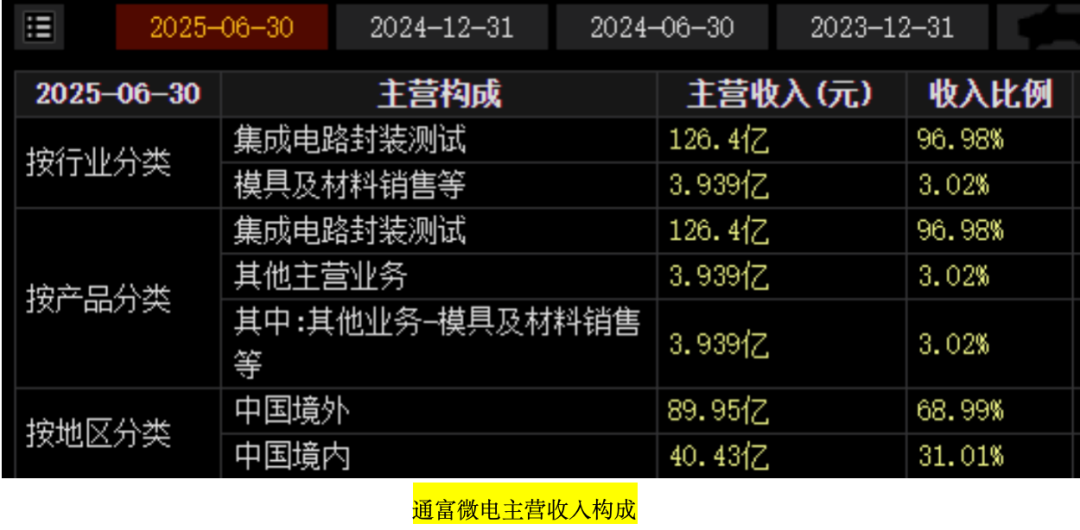 通富微电是国内半导体封装测试行业的头部企业之一,在全球封测市场位居第四、国内排名第二,为全球客户呈上从设计仿真、圆片中测,到封装、成品测试的全流程服务。作为国内率先达成7nm/5nm Chiplet封装量产的企业之一,通富微电与AMD高端CPU/GPU封测订单深度绑定,其终端应用覆盖手机、汽车、AI服务器等领域,其中集成电路封测业务在营收中的占比高达96%,业务聚焦程度极高。