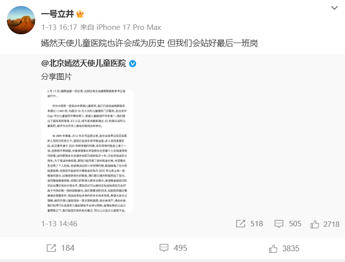 此事的起因是1月13日,李亚鹏转发了医院关于房租债务的回应,并配文称“嫣然天使儿童医院也许会成为历史,但我们会站好最后一班岗”。