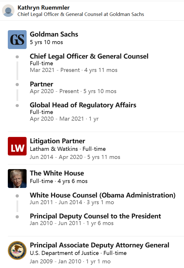 在加盟高盛之前,Ruemmler履历显赫,曾在美国司法部、白宫、瑞生国际律师事务所(Latham & Watkins)任职。