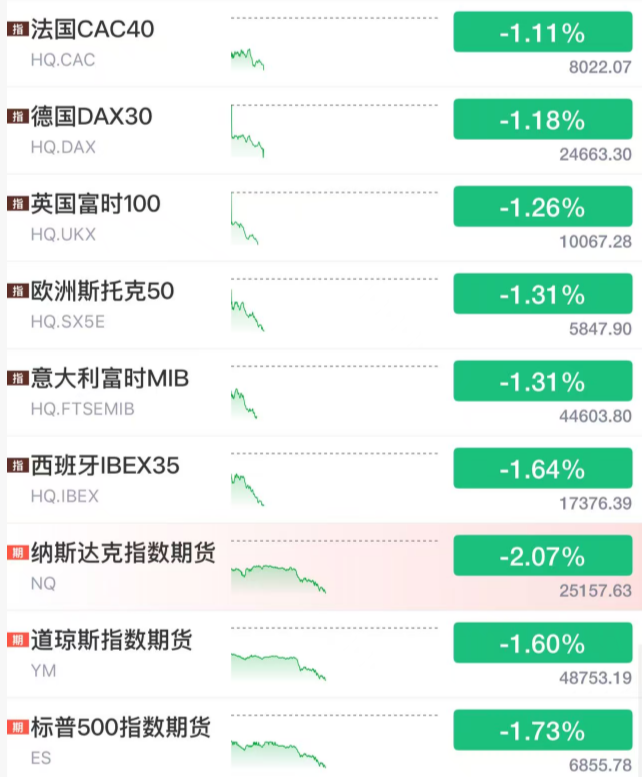 1月20日傍晚, 随着美国与欧洲在“控制格陵兰岛”问题上的对峙没有任何缓和迹象, 美股三大股指期货跌幅进一步扩大,道指期货暴跌约800点,纳斯达克指数期货暴跌2%,欧洲股市持续下跌。