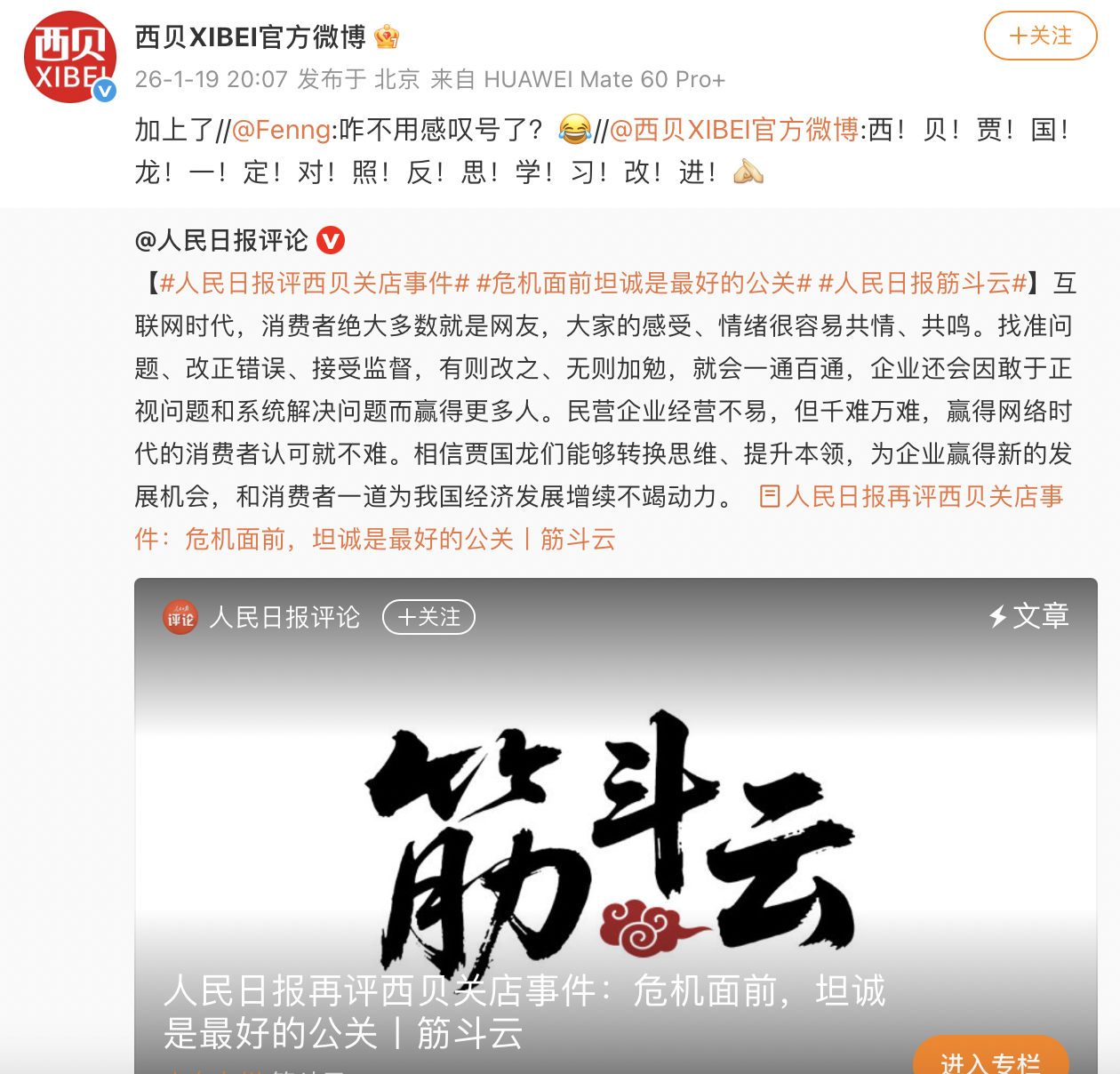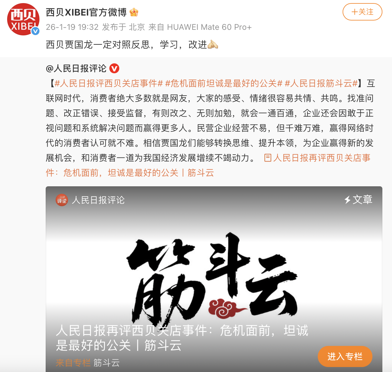 瑞财经 吴文婷 1月19日,人民日报再评西贝关店事件,发布评论文章《危机面前,坦诚是最好的公关》。