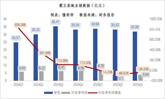 由于霸王茶姬不参加“外卖大战”,产品更新缓慢,业绩已明显降速。2025Q3营收32.08亿元,同比下滑9.4%,归母净利润3.94亿元,大幅下滑38.5%。