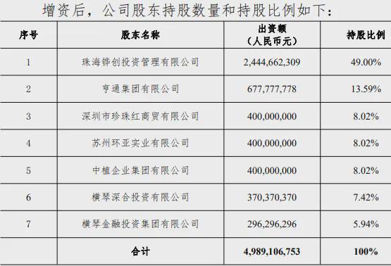 此次增资方涉及第一大股东珠海铧创以及亨通集团、横琴深合投资公司、横琴金融投资集团。