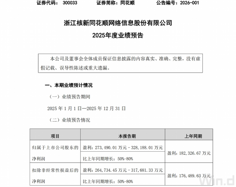 公告显示,2025年,同花顺归母净利润为27.35亿元至32.82亿元,比上年同期增长50%至80%。扣除非经常性损益后的净利润为26.47亿元至31.77亿元,比上年同期增长50%至80%。