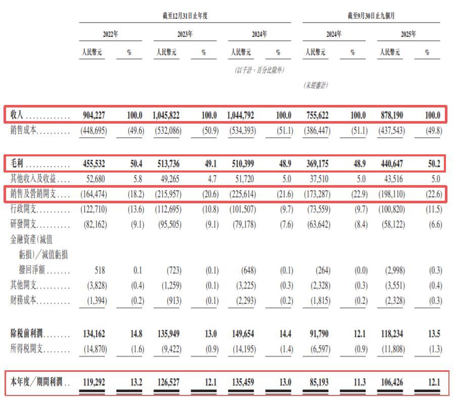 重营销、轻研发的SKG,研发费用率从2022年的9.1%一路降至2025年前三季度的6.6%,而销售费用率却从18.2%攀升至22.6%。