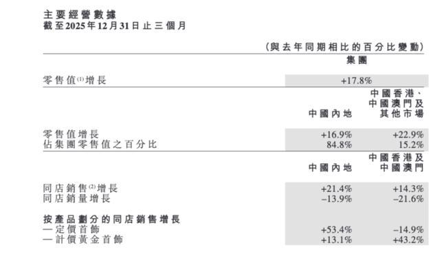 1月21日,周大福珠宝集团有限公司(周大福,1929.HK)发布截至2025年12月31日止三个月(2026财年第三季度)未经审核主要经营数据。数据显示,该季度,周大福零售值同比增长17.8%,其中,中国内地零售值同比增长16.9%,占集团零售值的84.8%;中国香港、中国澳门及其他市场零售值增长22.9%,占比15.2%。