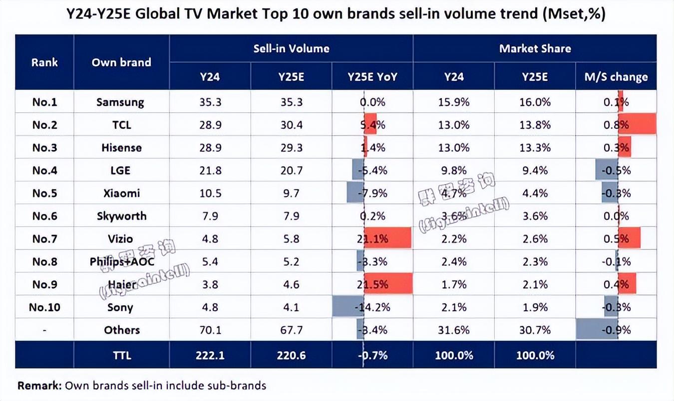 2025年,来自机构的统计数据显示,全球品牌中,有且仅有2家实现了出货量破3000万台的成就,其中三星以3530万台的出货量和16%的市占率拿下全球第一,中国的TCL以 3040万台的出货量和13.8%的份额成为亚军。