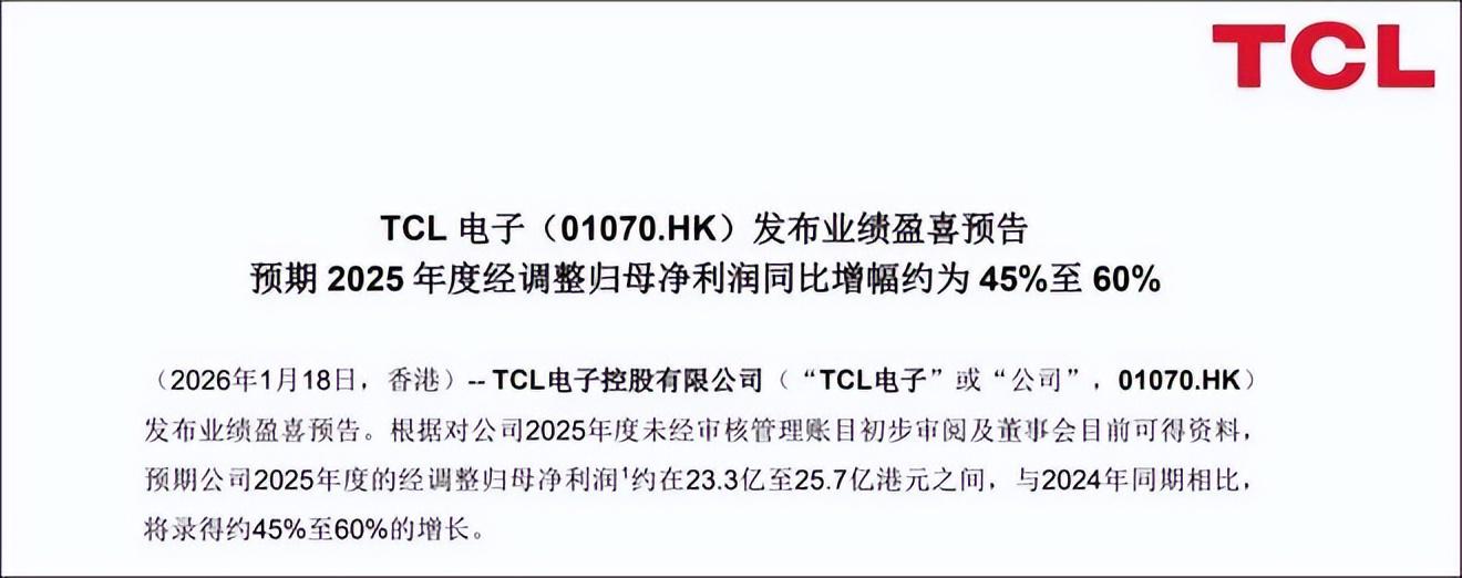 而且,就在此次战略合作备忘录签署的2天前,TCL电子还披露了1月18日晚,TCL电子发布2025年度业绩盈喜预告。集团预计2025年度经调整归母净利润约为23.3亿至25.7亿港元(约合人民币20.8亿元至23亿元),同比将增长约45%至60%,堪称“双喜临门。”