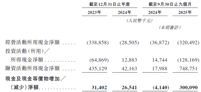 更严峻的是其现金流状况,2023年以来经营性活动产生的现金流量净额持续为负,且在2025年前三季度急剧恶化,现金流出同比暴增超7倍,达到-3.2亿元。这意味着导远科技主营业务的“自我造血”功能不仅缺失,而且失血速度在加速。