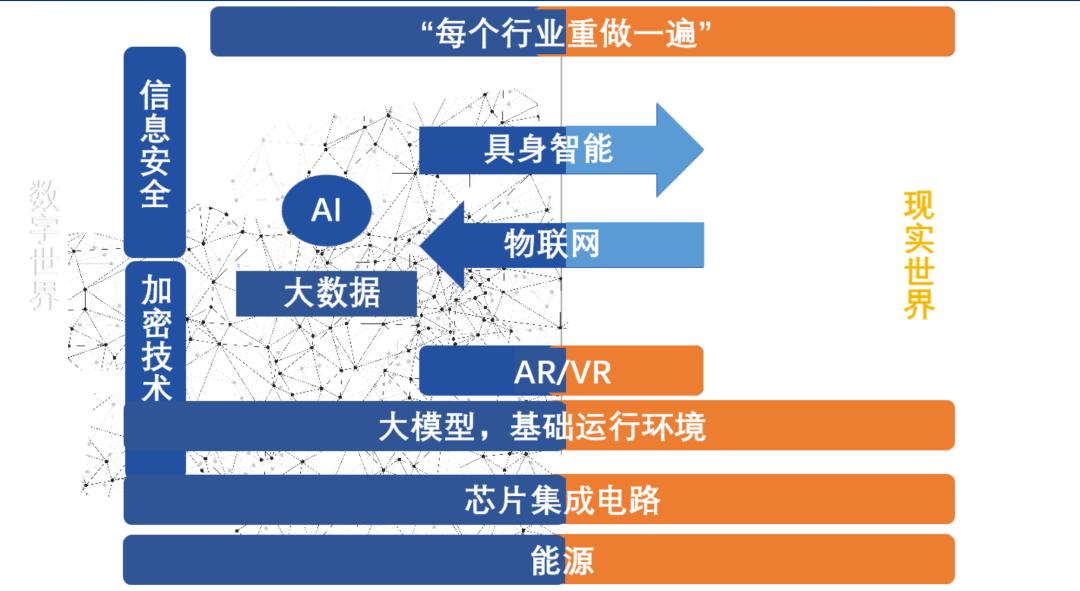 关于AI,我曾在2020年做过一张预测图,当时觉得像科幻,如今已基本成为现实。AI正从只能分析“你是谁”的判别式,进化到能发明新定理的推理式超级大脑。但我认为,它最终的归宿是“破壁而出”——通过机器人和物联网去操纵和感知现实世界,解决实体产业中(如软件定制化)的顽疾,通过深度学习实现自适应。