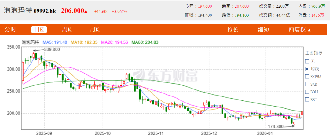 短期低点就在前几天,截至2026年1月19日收盘,泡泡玛特每股价格174.3港元,四个多月来累计下跌约49%,对于一家市值几千亿的上市公司来说,很夸张了。