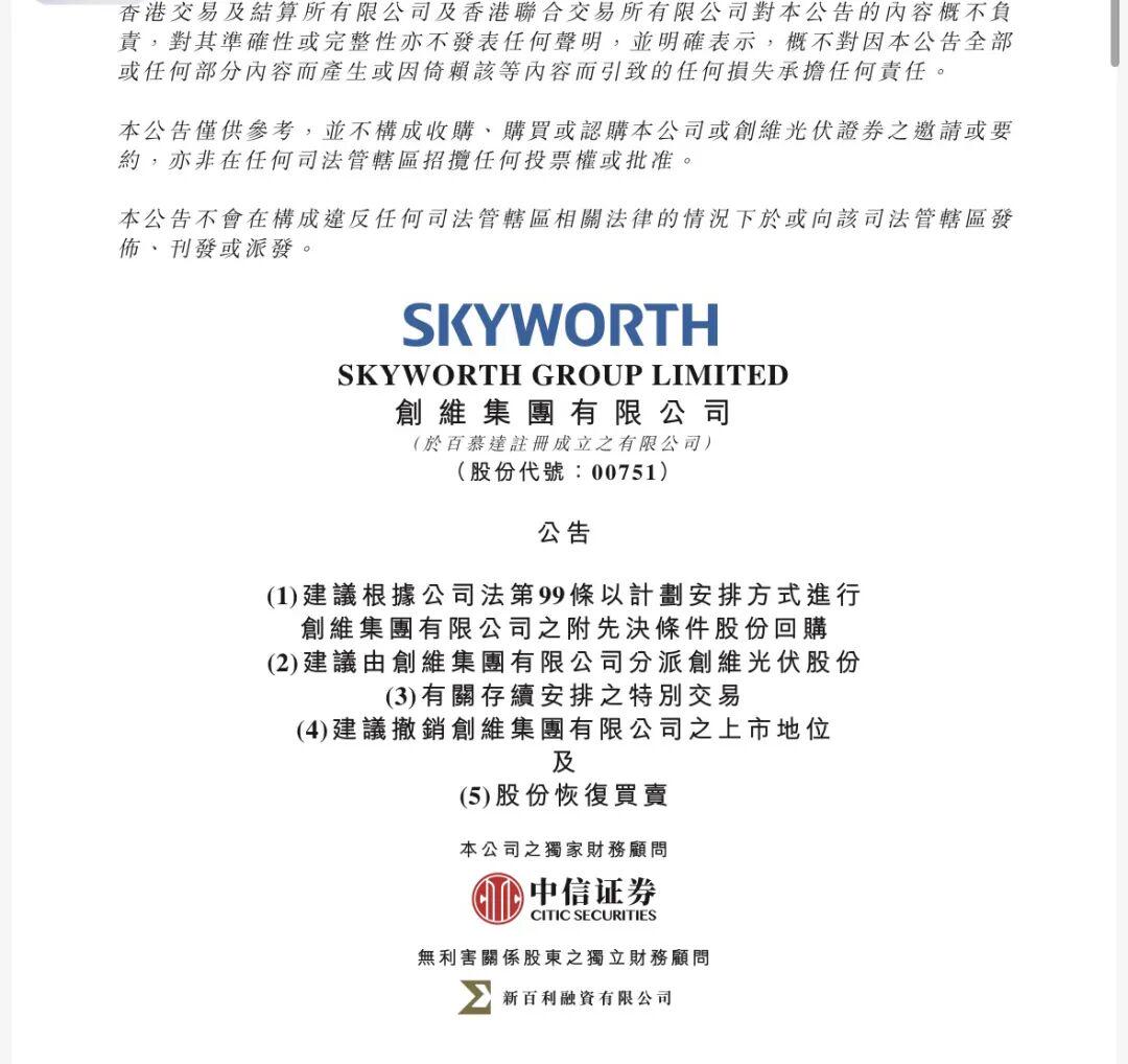 在最新的公告中,创维集团解释称,传统家电业务增长放缓,创维光伏已成营收和利润核心驱动力;当前市值未反映资产价值,私有化后创维光伏可拓宽融资渠道,提升国际品牌形象。
