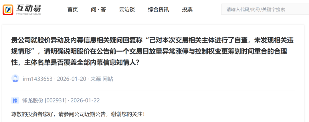 有投资者在深交所互动易平台直接向公司提出质问,要求明确说明“股价在公告前一个交易日放量异常涨停与控制权变更筹划时间重合的合理性”,并质疑其自查的“主体名单是否覆盖全部内幕信息知情人”。对此,公司仅回复“请参阅公司近期公告”。